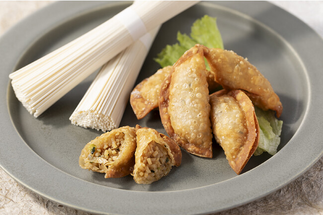 地元高校生のフレッシュなアイデアと八芳園MuSuBuシェフによる繊細な味付けがコラボしたメニューです。餃子に地元産の手延べひやむぎが詰まった未体験の食感と、タレなしでそのままいただける中華風の味付けが新しい味わいをご堪能ください。