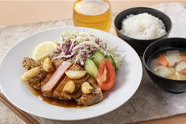 分厚く切った豚肉を濃厚ソースで炒め、たっぷりの千切りキャベツを添える四日市の名物料理「とんてき」を、八芳園MuSuBuシェフがアレンジ。食材の味わいを生かして、定食風に仕上げました。ボリュームたっぷりの肉の旨味を存分にご堪能ください。