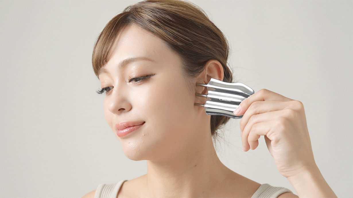 「Cellsh トリプルスティック」は、3本に並んだポイントスティックで肌を広範囲にとらえつつ、細かな部位にも繊細にアプローチできるよう設計されています。スティックの形状は、頭皮、目元・口元・鼻まわりなどの顔まわり、さらにデコルテラインまで、気になる部位にしっかり届く構造です。