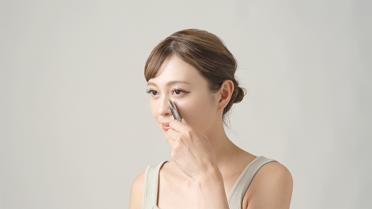 鼻筋のケアをしたい方に♪眉間の下あたりから鼻先までの軟骨に沿って、鼻筋にポイントラインを滑らせてケアしていきましょう。