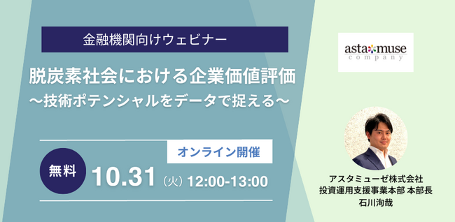 アスタミューゼ株式会社(本社:東京都千代田区、代表取締役社長 永井歩)は、2023年10月31日(火)12:00-13:00に、金融機関の方々を対象とした無料ウェビナー「脱炭素社会における企業価値評価〜技術ポテンシャルをデータで捉える〜」を開催いたします。9月に開催した同タイトルのウェビナーが大変好評だったため、10月にも再開催いたします。