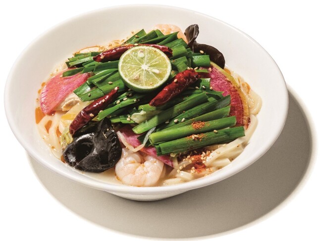 海老や豚肉、キャベツや紅芯大根など具だくさんの人気メニュー『ちゃんぽんうどん』を激辛アレンジ。もつ鍋をイメージしたどっさりのニラとマイルドな白湯スープに『大魔王』や胡麻ラー油、コチュジャンなど奥深い辛みを加えました。すだちを絞ってさっぱりとお召し上がりください。