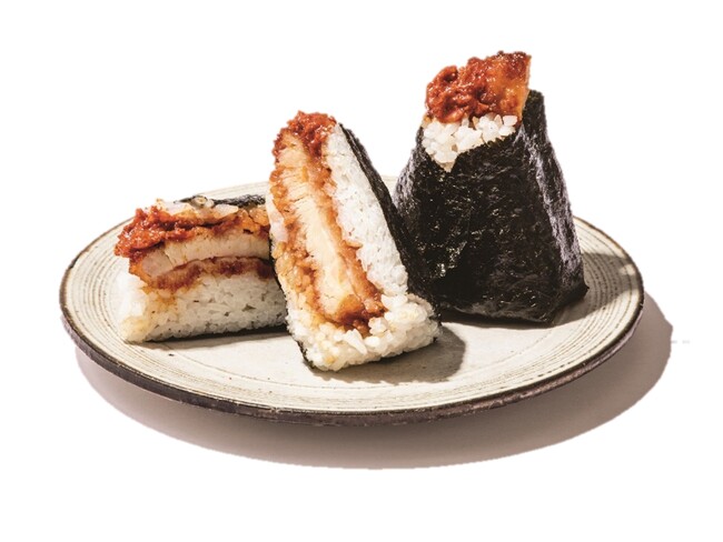 ハリッサ唐辛子ペーストを揚げた鶏肉にトッピング。鮮やかな「赤」が食欲をそそるおむすびです。