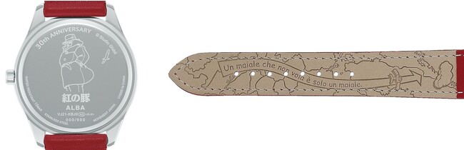 「紅の豚」のテーマである「カッコイイとは、こういうことさ。」のメッセージを込め、裏蓋には主人公がたたずむ姿が、レザーストラップの裏面には映画からの名セリフ「飛ばねえ豚はただの豚だ」が、イタリア語で記されています。