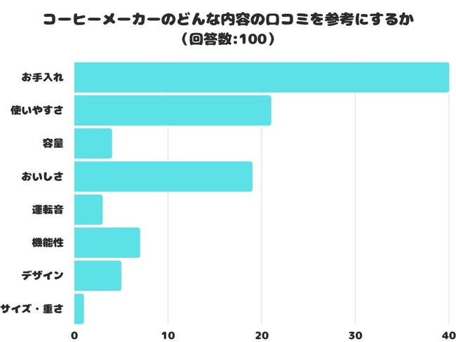 コーヒーメーカーのどんな内容の口コミを参考にするかをアンケートにて調査したところ、1位は「お手入れ」でした。