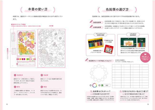 本書はぬり絵本ながらオールカラーとし、左側にお手本(色使いの提案)、右側にぬりえ(自分でぬる用の絵)を掲載。お手本の配色見本では、ベースカラー・アクセントカラー・メインカラーの3つにカテゴリーを分け、それぞれの童話のイメージを伝える色を提案します。