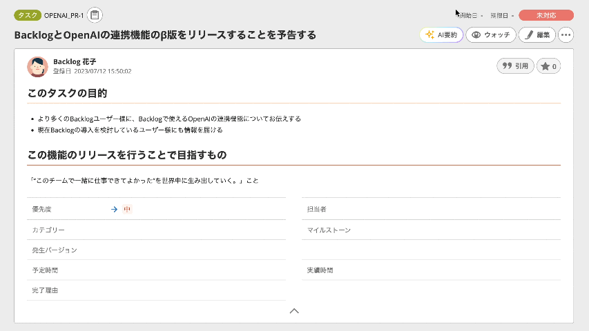 Backlog、課題の「AI要約」機能のβ版を改善!コメントに対する「返信の提案」機能などを追加