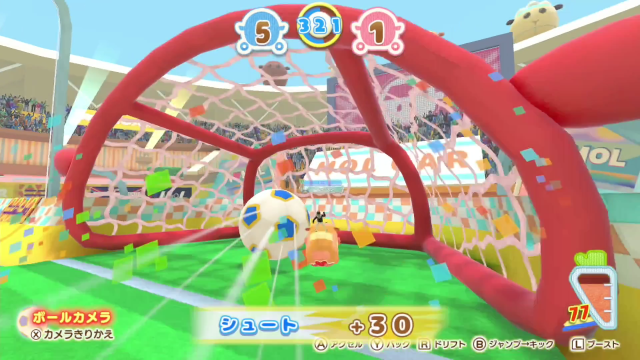 サッカースタジアムで、チームに分かれてモルカー同士の白熱サッカー対決だ!離れたところにいる友だちや全国の猛者たちと、最大3vs3で盛り上がろう!