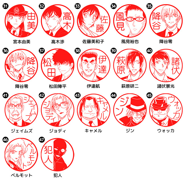 コナンに新一、キッド、安室、赤井といったおなじみのキャラクターに、ウォッカやジェイムズ、キャメルなど10キャラクターが追加され全47種類に。荷物の受け取りやサインがわりはもちろん銀行登録にも。
