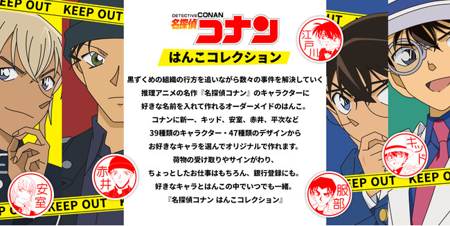 「名探偵コナン はんこコレクション」はTVアニメ『名探偵コナン』のお気に入りのキャラクターと好きな名前や文字でつくれるオーダーメイドのはんこ。2021年5月より販売を開始し、「名探偵コナン」ファンを中心にこれまでたいへんご好評をいただいてまいりました。