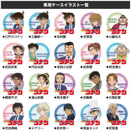 いずれも「名探偵コナン」の39名のキャラクターがデザインとして選べる専用ケース付きとなります(通常はブルーのケース、黒ずくめの組織に属するジン・ウォッカ・ベルモット、そして犯人はブラックのケースとなります)。