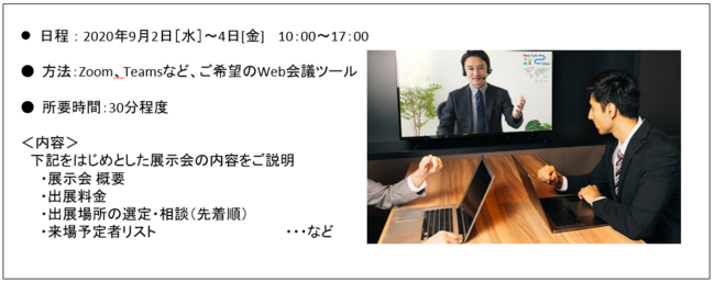 2020年9月2日(水)〜4日(金)の3日間、オンラインでの開催発表・出展説明会が実施される。参加費は無料、事前申込み制となっている。説明会の参加企業から優先的に出展申込を受付ける予定だ。席数に限りがあるため、興味のある企業は早めにお申込みしてほしいと事務局は呼び掛けている。
