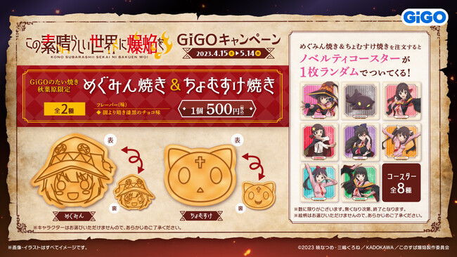 GiGOのたい焼きにて「めぐみん焼き&ちょむすけ焼き」を販売いたします。1 個お求めの方に、オリジナルコースター(全 8 種/ランダム)を 1 つプレゼント!