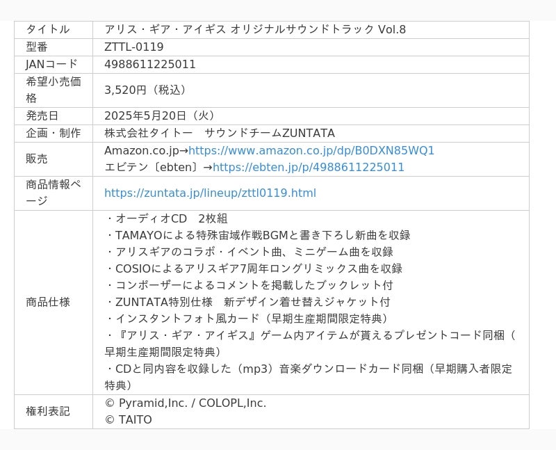 株式会社タイトー(本社:東京都新宿区、以下タイトー)は、スマートフォン向け武装カスタマイズアクションゲーム『アリス・ギア・アイギス』(株式会社コロプラ/開発:株式会社ピラミッド)のサウンドトラックCD第8弾『アリス・ギア・アイギス オリジナルサウンドトラック Vol.8』を、タイトーのCDレーベル「ZUNTATA RECORDS」より2025年5月20日(火)に発売します。本日2月28日(金)からAmazon.co.jpとKADOKAWAのECサイト『エビテン』に