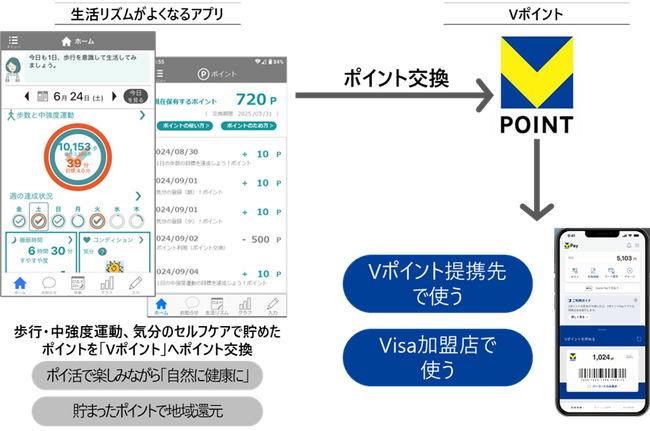 生活リズムがよくなるアプリ」は、日立システムズが2022年2月からサービスを提供している、企業の健康経営を支援する「健康支援サービス(健康経営)」の従業員向けアプリケーションです。本アプリケーションは従業員一人ひとりの、からだとこころのセルフケアをサポートしており、歩行や中強度運動をすることや、気分のセルフケアを登録することでポイントを貯める機能を有しています。この度、貯めたポイントを、10ポイント→1ポイントのレートでVポイントに交換できるようになります。交換したVポイントは、日本全国のVポイント提携先や世界中のVisa加盟店での利用が可能です。