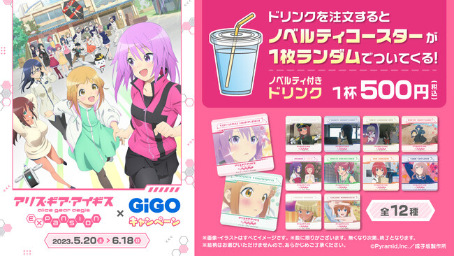 株式会社GENDA GiGO Entertainment(本社:東京都港区 代表取締役社長:二宮 一浩 以下、当社)は、GiGOグループのお店におきまして2023年5月20日(土)より、アニメ「アリス・ギア・アイギス Expansion」とのコラボキャンペーン「アリス・ギア・アイギス Expansion×GiGO キャンペーン」を開催いたします。