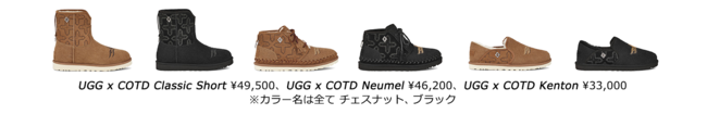 アメリカ西部へのオマージュを込めたこのコレクションは、大胆な刺繍デザインとChildren of the discordanceのシグネチャーメタルバッジを採用し、デザイナー志鎌氏のシグネチャーグラフィックスタイルを表現しています。耐久性のある軽量ソール、ソフトなスエード素材のアッパー、そしてUGG(R)ブランドのシグネチャーでもあるシープスキン素材とUGGplush™アップサイクルウールのライニングにより、UGG x COTD Classic Short(UGG x COTD クラシック ショート)ブーツに新しいテイストを取り入れ、その見た目と同じくらい快適な履き心地を実現しています。UGG x COTD Neumel(UGG x COTD ニューメル)はタッセル付きのレザーレース、UGG x COTD Kenton(UGG x COTD ケントン)は柔らかい折りたたみ可能なヒールが特徴の商品です。