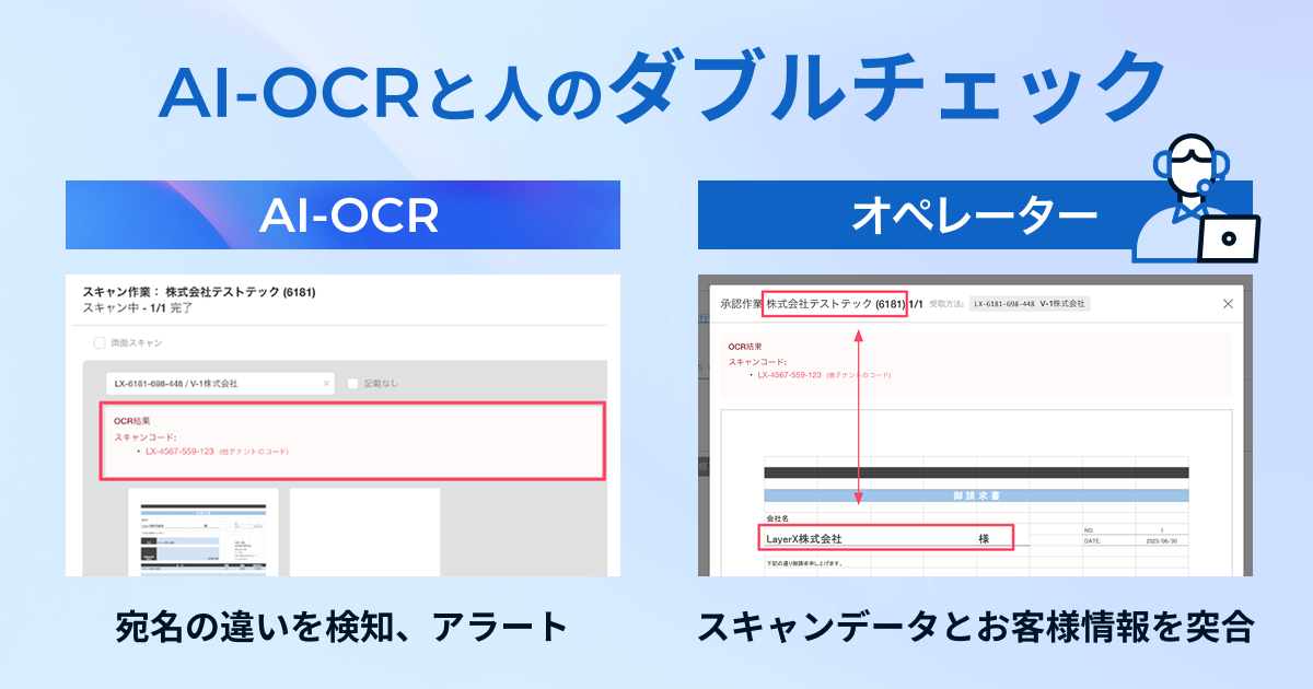 例えば、AIは宛名照合やデータ抽出精度の判定、項目間の整合性確認などを自動で行います。それと並行してオペレーターがスキャン時の画像品質チェック、最終承認前のクロスチェックを実施することで、システムと人の双方の強みを活かした高精度なオペレーションを実現しています。