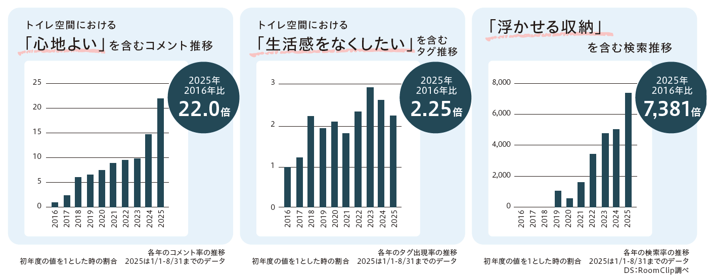 本製品の監修にあたったRoomClipのユーザーデータ(※1)をみると、トイレ空間における「心地よさ」や「生活感をなくしたい」に関連するコメント・タグがここ数年で伸長しており、トイレの見た目や、トイレでの居心地の良さを追求する層の存在が示唆されます。