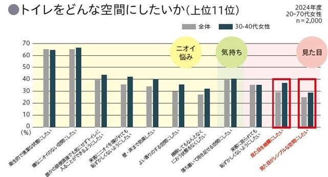 エステーが20-70代の女性を対象に実施した調査でも(※2)、「トイレをどんな空間にしたいか」という質問に対し、「見た目を綺麗にしたい」「見た目がシンプルな空間にしたい」の項目が、全体と比較して30-40代のファミリー世代において高い傾向でした。