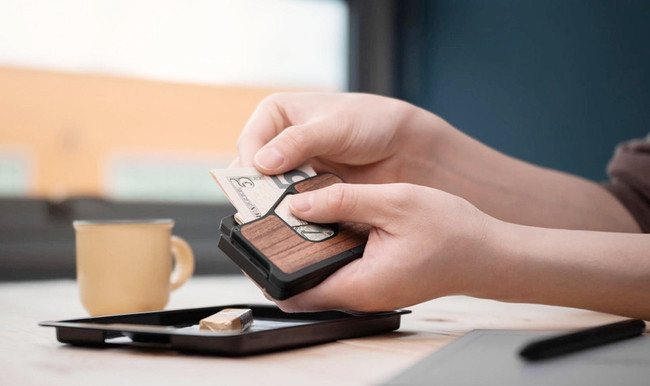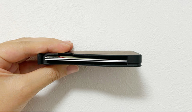 厚みは最大で"本体+3mm"までしか増えないので、ウォレットにカードを複数枚収納しても見た目が膨らんで不恰好になってしまうこともありません。また、素材はアルミニウムとカーボンを併用しているため、重さは44g〜と超軽量なのも嬉しいポイントです。また、スキミング防止機能が付いているのも安心です。
