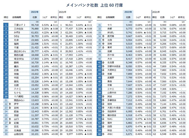 2022年の全国メインバンク社数トップは「三菱UFJ銀行」となった。企業数は9万5718社となり、2009年の調査開始以降14年連続のトップとなった。しかし、社数は減少が続いているほか、全国シェアも6.53%と前年から0.11ポイント(pt)減少。13年連続のシェア縮小となり、減少幅は21年に続き全金融機関で最大となっている