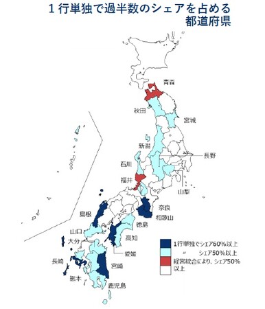 1行が単独過半数のシェアを有する都道府県は合計20に上り、前年に比べ変化はなかった。ただ、既に経営統合が発表されている青森県(青森銀行+みちのく銀行:シェア70.51%)、福井県(福井銀行+福邦銀行:同55.12%)を加えると、単独過半数シェアの都道府県は計22となる。愛知県では経営統合する愛知銀行と中京銀行のシェア合計は約1割にとどまるが、県内トップシェアの三菱UFJ銀行に次ぐ県内2番手の規模となる。2022年に新たに経営統合の方針が発表された長野県(八十二銀行+長野銀行:同61.62%)は、八十二銀行単独で県内シェア50%を超える。一方、福岡県における福岡銀行と福岡中央銀行のシェア合計は38.37%にとどまった。