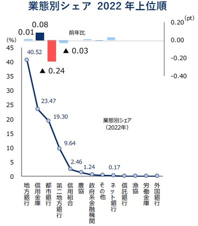 他方、全国で3メガを含む「都市銀行(メガバンク)」のシェアは19.30%で、前年を0.24pt下回り過去最低を更新した。シェアの低下幅は前年と並んで2009年以来過去最大で、シェア縮小の傾向が続く。「第二地方銀行」(シェア9.64%)は4年連続で1割を下回り、2年連続で前年から縮小した。「信用組合」(シェア2.46%)は3年ぶりにシェア低下の動きが止まった。