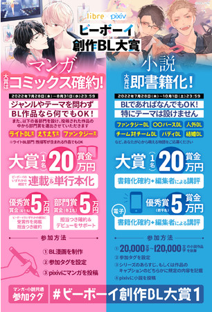 リブレ×pixiv「ビーボーイ創作BL大賞」本日7/28より募集START! BLマンガとBL小説の投稿を募集♪ 大賞は書籍化確約!