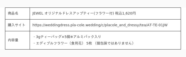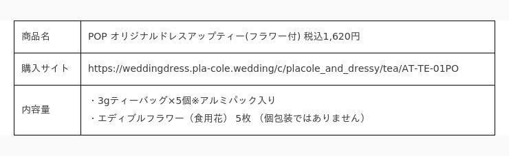 『個性が煌めく魔法の言葉』 "100人の人生に100通りに煌めく魔法をかける"をテーマに創設された古都鎌倉発のラグジュアリーブランド、PLACOLE&DRESSY(プラコレ&ドレシー)がプロデュースする名古屋駅直結KITTE名古屋3Fウェディングのテーマパークカフェ『DRESSY CAFE -きらめく魔法にかかる空間-』と専用ECサイト『DRESSY ONLINE』にて販売しているオリジナルブレンドティーと農薬不使用のエディブルフラワー(食用花)のセットに新作紅茶『JEWEL(ジュエル)』『POP(ポップ)』『HOPE(ホープ)』の3種が仲間入り!1から独自で調合したオリジナルブレンドは、香り高く、華やかなカラーが特徴的です。 それぞれのフレーバーに込められたメッセージと、色鮮やかな花のパッケージは、特別な瞬間を彩るためのギフトにもぴったりです。期是非おうちで、PLACOLE&DRESSYがつくる自慢の紅茶をお楽しみください。