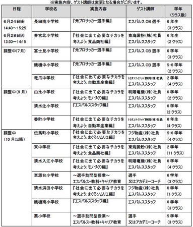 エスパルスの選手・スタッフ・職員、また市内の企業社員が小・中学校を訪問し、ゲスト講師となって算数や理科などにサッカーを関連付けた内容や社会に出て必要なチカラを考えるキャリア教育授業を小学校13校、中学校2校の計15校で行います。