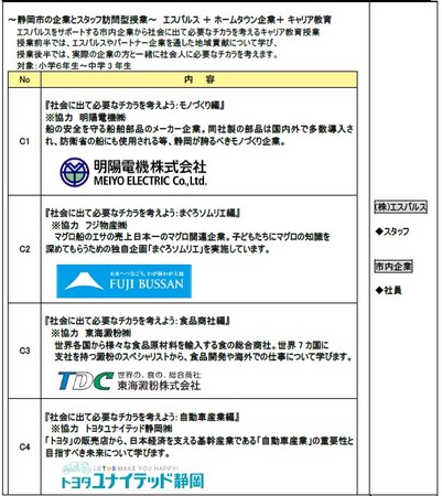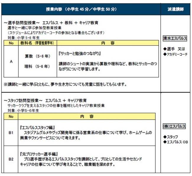 エスパルスは、2011年度からエスパルス、静岡大学教育学部、静岡市の協働事業として実施していたエスパルスドリーム教室に、静岡市内企業4社と連携した授業内容をプラスし、『エスプラス』を実施しますのでお知らせいたします。