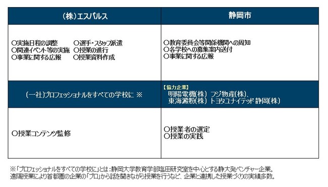 本事業は、(株)エスパルス、(一社)プロフェッショナルをすべての学校に(静岡大学ベンチャー企業)、静岡市内の協力企業、静岡市の四者が連携して行う協働事業です。