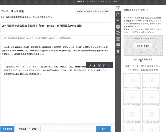 2016年9月9日(金)より、「PR TIMES」企業会員は、プレスリリース登録画面の「画像ファイルをアップロード」メニューより、「PIXTA」の膨大な画像素材(素材総数1930万点超のうち今回の連携で利用可能な1500万点超)の中からキーワード検索して選んだ素材を、追加料金なしでプレスリリースへ自由自在に配置することができます。