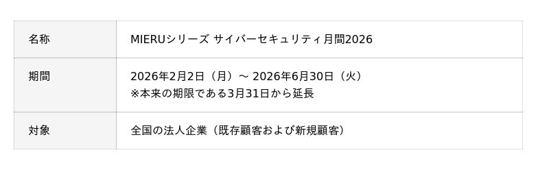 株式会社アイエスエフネット(本社:東京都港区/代表取締役:渡邉幸義、以下アイエスエフネット)は、2026年2月2日より実施しておりますセキュリティ対策支援キャンペーン「MIERUシリーズ サイバーセキュリティ月間2026」につきまして、大変多くの企業様からご好評をいただき、キャンペーン期間を2026年6月30日まで延長することを決定いたしました。