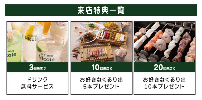 この度、『スパイスBBQ Nicole』では公式アプリをリリースいたしました。アプリ限定のお得なクーポン、キャンペーン情報やイベント情報など、お得で便利にNicoleをご利用いただけるコンテンツを随時配信していきます。また、3回のご来店で「ドリンク無料サービス」、10回のご来店で「お好きなくるり串5本プレゼント」など来店回数に応じて嬉しい特典も!さらに初回ダウンロード特典として、「牛ハラミ」(350円相当)を1本プレゼントいたします。この機会にNicoleのアプリをダウンロードしていただき、ジューシーな牛ハラミ串をお好みのスパイスと共にぜひお楽しみください。