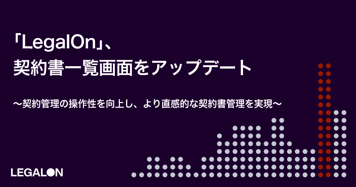 株式会社LegalOn Technologies(本社:東京都渋谷区、代表:代表取締役 執行役員・CEO 角田 望、以下:LegalOn Technologies)が提供する、法務特化型AIエージェント搭載のWorld Leading Legal AI「LegalOn」(https://www.legalontech.com/jp/)は、コントラクトマネジメント機能の中核となる契約書一覧画面をアップデートしました。本アップデートにより契約管理の操作性が向上し、より直感的な契約書管理が可能になります。