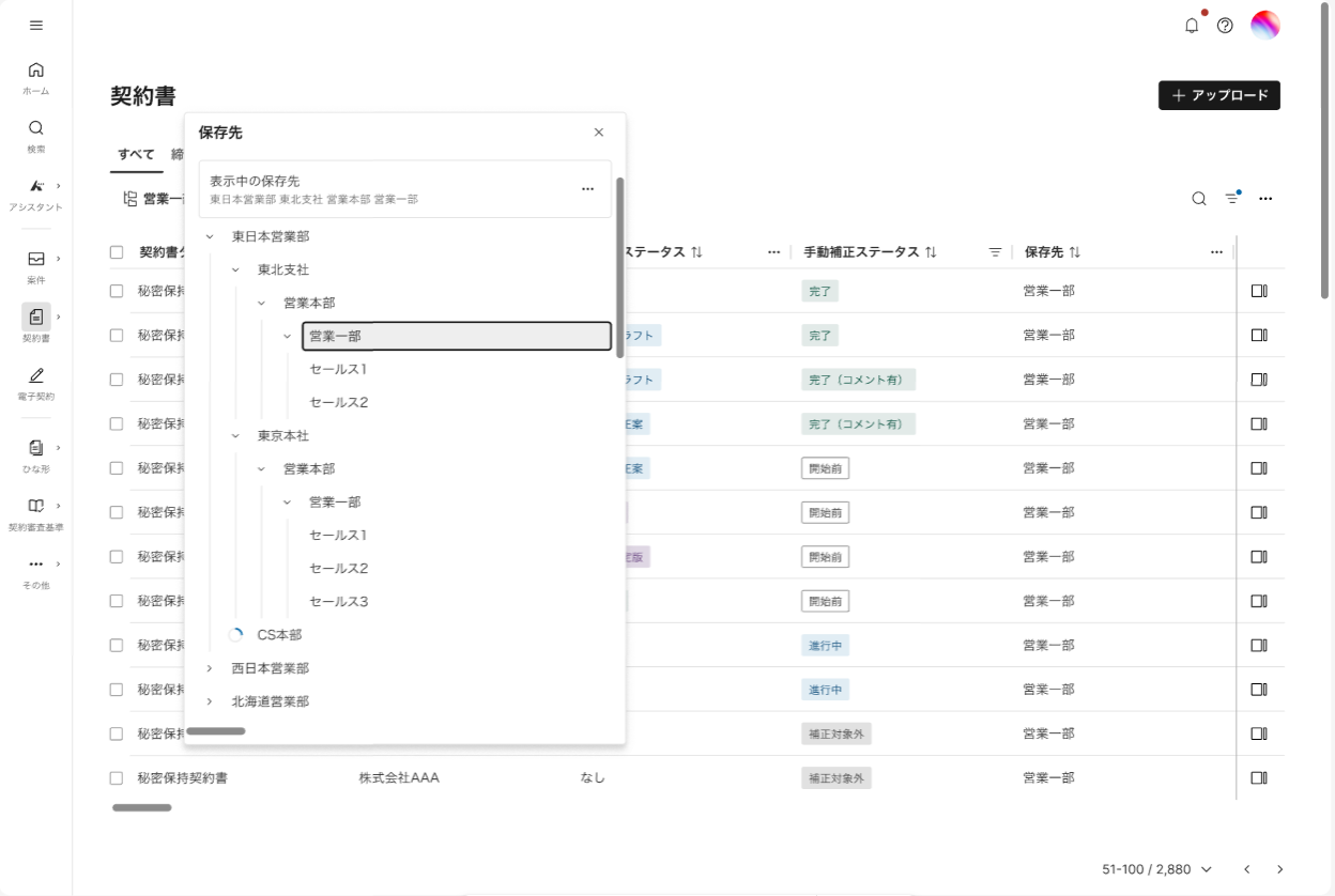契約書を保存するフォルダの視認性が向上しました。フォルダの階層を視覚的に確認しながら絞り込めるUIに変更することで、契約書を探す際のストレスを軽減し、検索性を向上させています。
