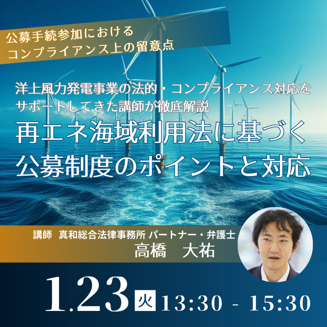JPI(日本計画研究所)は、各地の洋上風力発電などの再エネ事業の法的・コンプライアンス対応をサポートしてきた真和総合法律事務所 パートナー・弁護士 高橋 大祐 氏をお迎えし、再エネ海域利用法の運用上の論点を含め、洋上風力発電の事業化・ファイナンスにおける法的課題と最新の実務対応について詳説いただくセミナーを開催します。