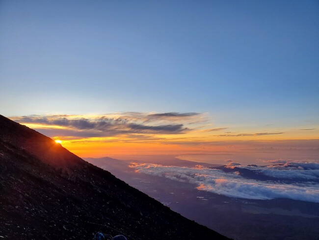 朝、うっすらとオレンジ色に地面が染まる頃、皆はまだ9合目付近でした。