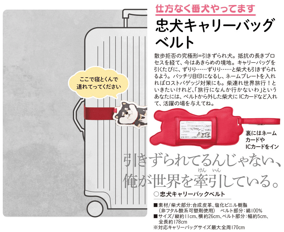 散歩拒否の究極形=引きずられ犬。抵抗の長きプロセスを経て、今はあきらめの境地。キャリーバッグを引くたびに、ずりり……ずりり……と柴犬も引きずられるよう。バッチリ目印になるし、ネームカードを入れればロストバゲッジ対策にも。柴連れ世界旅行!といきたいけれど、「旅行になんか行かないわ」というあなたには、ベルトから外した柴犬に ICカードなど入れて、活躍の場を与えてね。