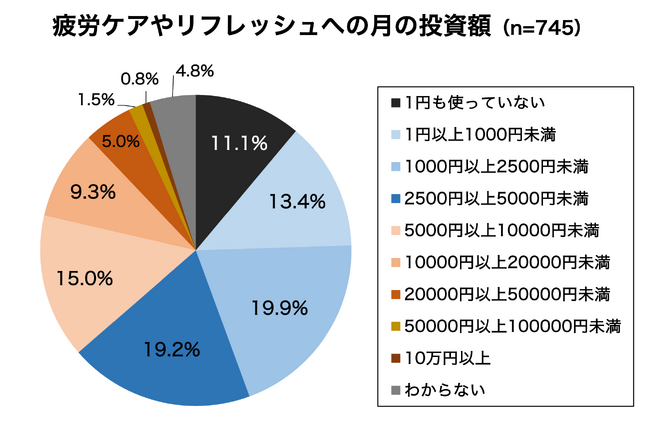 最後に疲労ケアやリフレッシュに月々どのくらい投資しているかを調査したところ、ボリュームゾーンは「1000円以上2500円未満」(19.9%)、「2500円以上5000円未満」(19.2%)となり、10000円以上投資している人も16.6%存在することがわかりました。一方で、「1円も使ってない」(11.1%)という人が10人に1人程度いる結果となりました。