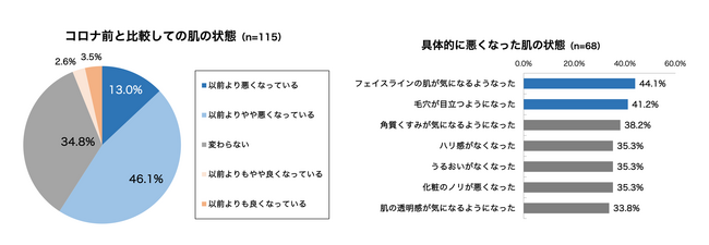 さらに、「以前より肌が悪くなった」人に対して、具体的な肌の状態を質問したところ、1位「フェイスラインの肌が気になるようになった」(44.1%)、2位「毛穴が目立つようになった」(41.2%)という結果になりました。