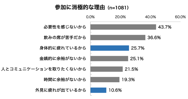 《参加したくない理由は「必要性を感じない」、「飲みの席が苦手」が上位を占める一方、「身体的に疲れている」(25.7%)、「外見に疲れが出ている」(10.6%)と“疲労”を理由にする人も多く存在》
