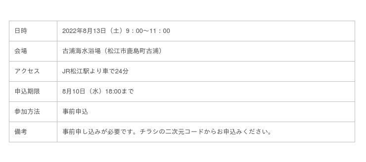 2022年8月13日(土)9時〜11時 <松江市鹿島町 古浦海水浴場>