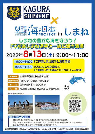 海と日本プロジェクトinしまね実行委員会は、JFL所属のサッカーチームFC神楽しまねとのコラボレーションで、8月13日(土)に松江市の古浦海水浴場で、海岸清掃とビーチサッカーをかけ合わせたイベントを開催します。イベントではまずFC神楽しまねの選手と一緒に海岸清掃を実施、その後きれいになった海岸で選手とともにドリブルリレー対決を開催します。一緒にクリーンな汗を流しましょう!