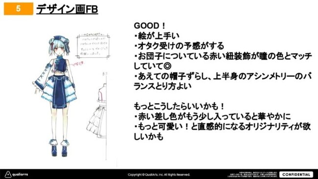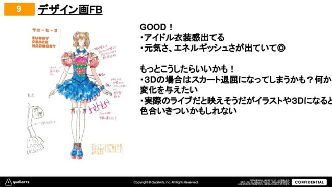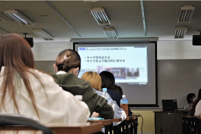 本授業の事前にアイドル衣装のファッションデザイン画(参加学生数分)を送付し、9点を厳選していただき、授業内で講評いただきました。また、衣装をデザインする上での着目点や制作のフローやゲームキャラクターとして実装させていく上での要件。さらには衣装デザイナーとアニメ、ゲーム制作側の十分な連携の必要性に関しての授業を講義いただきました。また実際に声優の方が着用される衣装にも業者と連携し制作されており、その状況に関してもご教授いただきました。