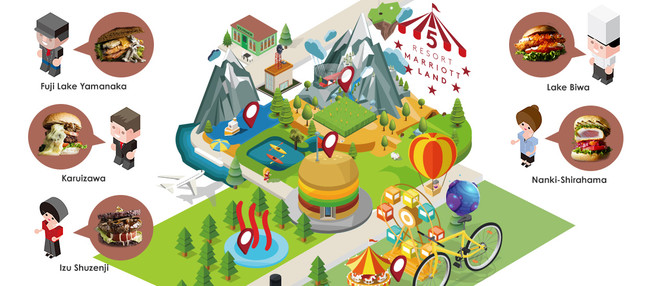 5つのリゾートマリオットホテルの5周年を記念し、5つのホテルをテーマパークに見立てた、食・温泉・体験アクティビティ・水・高原の5つのアトラクションをご用意。各ホテルやホテルの立地する地域がもつ、それぞれのコンテンツを紹介するほか、今回ご用意した5つの特製ご当地バーガーの紹介や、本日より開催する「5周年記念ご当地バーガー総選挙」の最新の投票状況のわかるバーガーショップ、イベント企画「Mさんを探せ!」など、様々なコンテンツが用意されています。