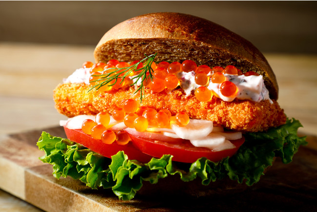 ビワマスのフライに赤蕪のタルタルとイクラを合わせ、滋賀県産ほうじ茶を練り込んだ香り高いバンズでサンド。アクセントにトッピングのイクラの濃厚な味わいと日野菜の漬物の食感をお楽しみください。