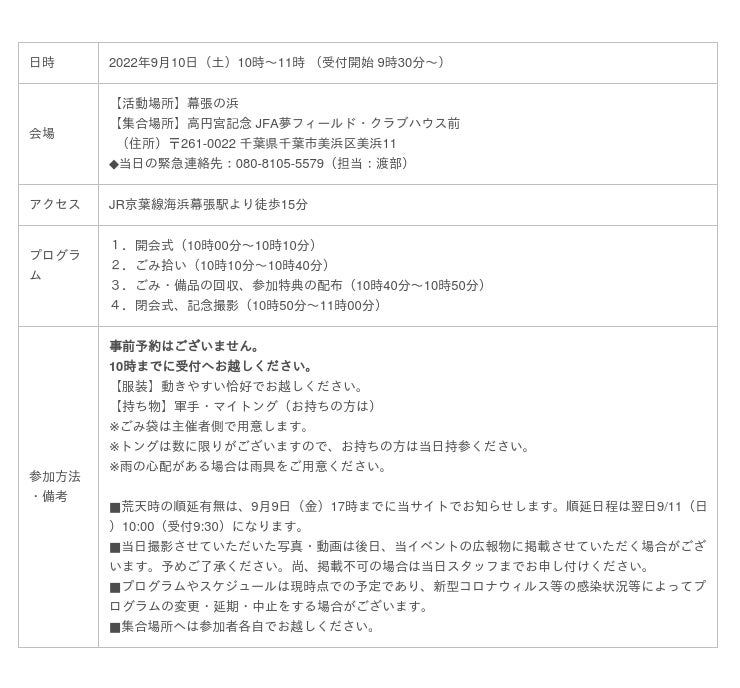 2022年9月10日(土)10時〜11時(受付9時30分〜)@幕張の浜